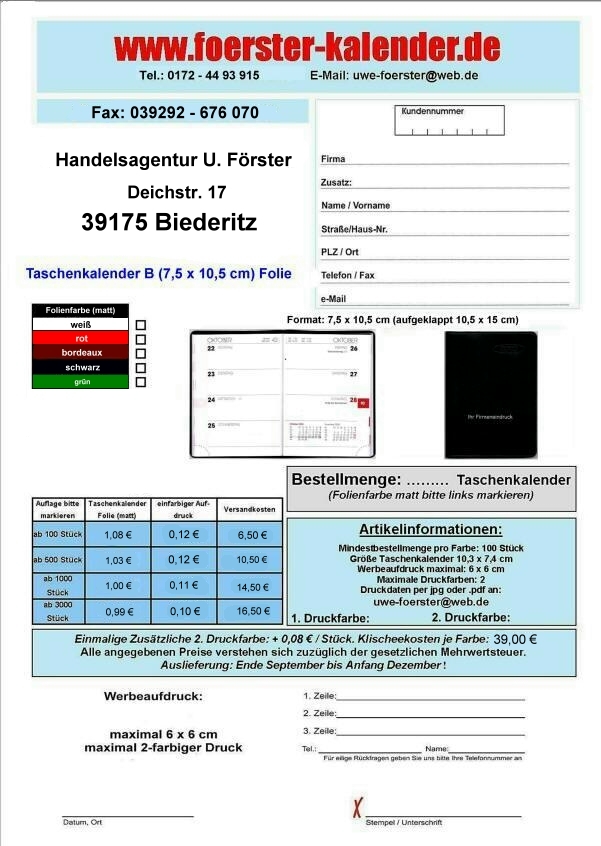 zurück Bestellschein Taschenkalender B 7,5 x 10,5 cm (Folie matt)